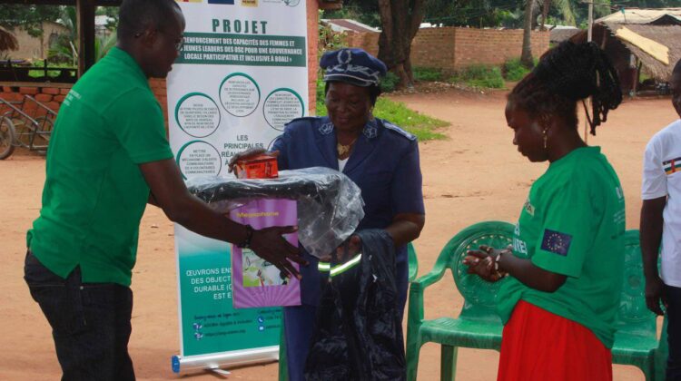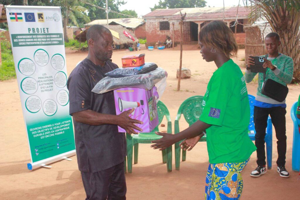 Composé de mégaphone, imperméable, botte, sac au dos, bloc note, stylo, téléphone sur flotte, tee shirt des volontaires, ces outils et équipements sont distribués par #ADORA, partenaire de mise en œuvre de International Rescue Committee Centrafrique dans le cadre du projet « Appui au renforcement des Organisations de la Société Civile de Centrafrique », financé par Union européenne en République Centrafricaine.